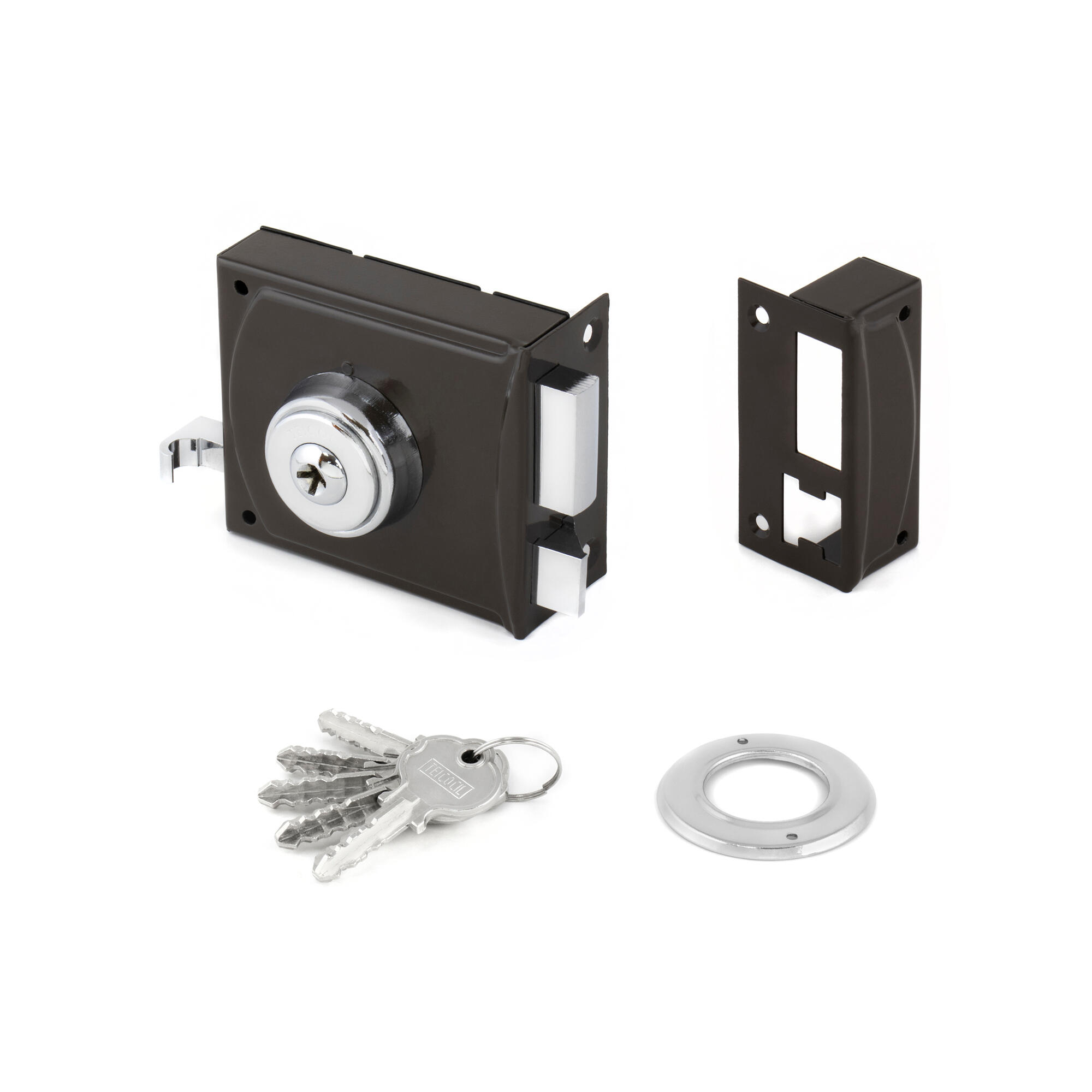 Esta fechadura é ideal para garantir a segurança de portas interiores, combinando funcionalidade e estética na sua concepção. Distância entre eixos: 10cm. Altura do cofre: 55mm. Largura do cofre: 65mm. Material do cofre: latão. Tipo de produto: fechadura de sobrepor. Ventajas do Produto: este modelo oferece um design contemporâneo com um sistema de bloqueio eficiente, refletindo segurança e durabilidade.