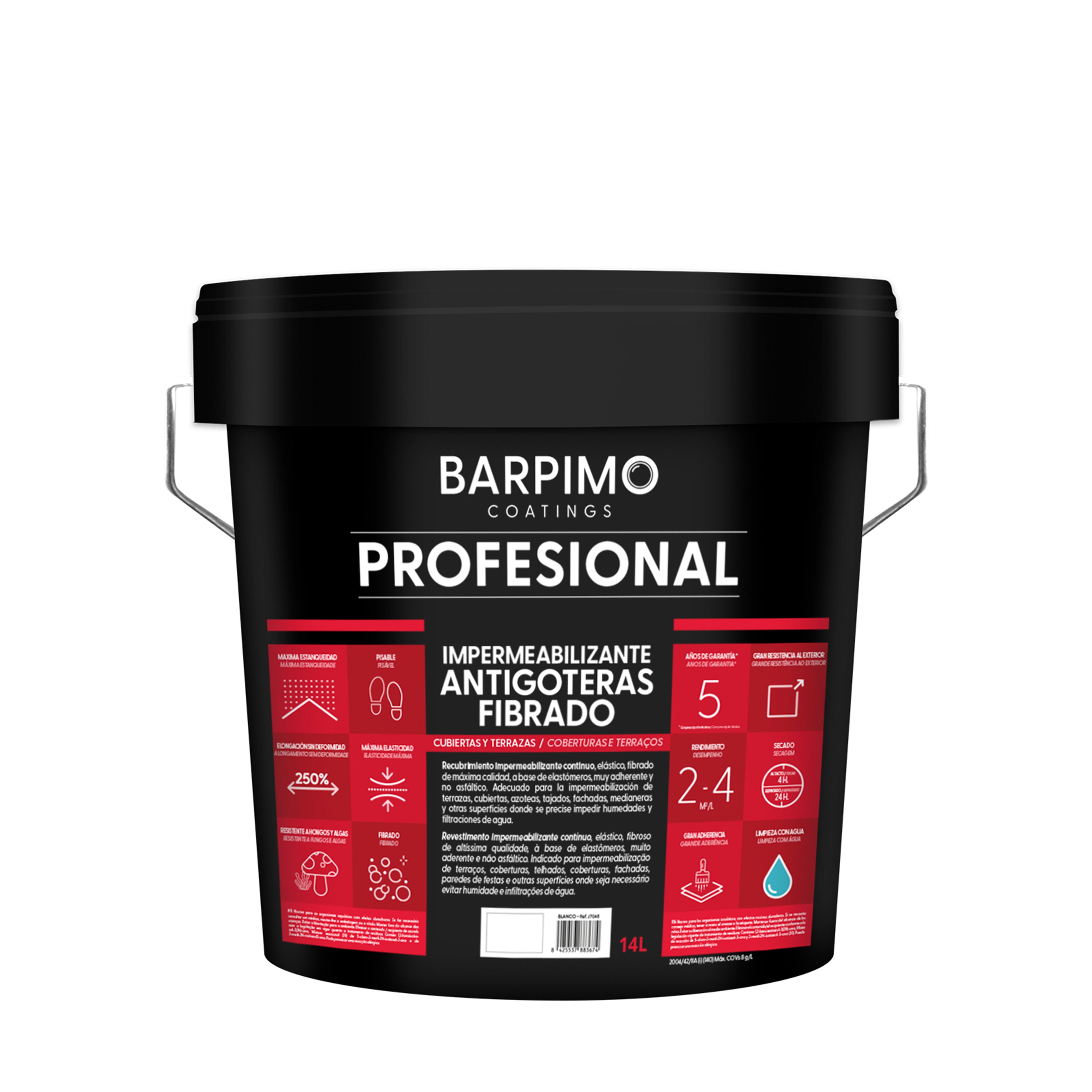 Revestimento impermeabilizante de alta qualidade, elástico e reforçado com fibra de vidro, ideal para a proteção contra infiltrações em várias superfícies. Tipo de Solução: impermeabilizante fibrado, adequado para aplicações em telhados e áreas expostas às intempéries. Usos: ideal para impermeabilização de terraços, telhados, coberturas planas e muros de separação. Uso: exterior. Rendimento: 2-4m2/camada, dependendo do estado e da estrutura da superfície. Propriedades: transitável tráfego ligeiro, com secagem ao toque em 30-60 minutos e repintura após 14-18 horas. Vantagens do Produto: forma uma membrana contínua, elástica e impermeável, resistente a alterações térmicas e à alcalinidade dos substratos.