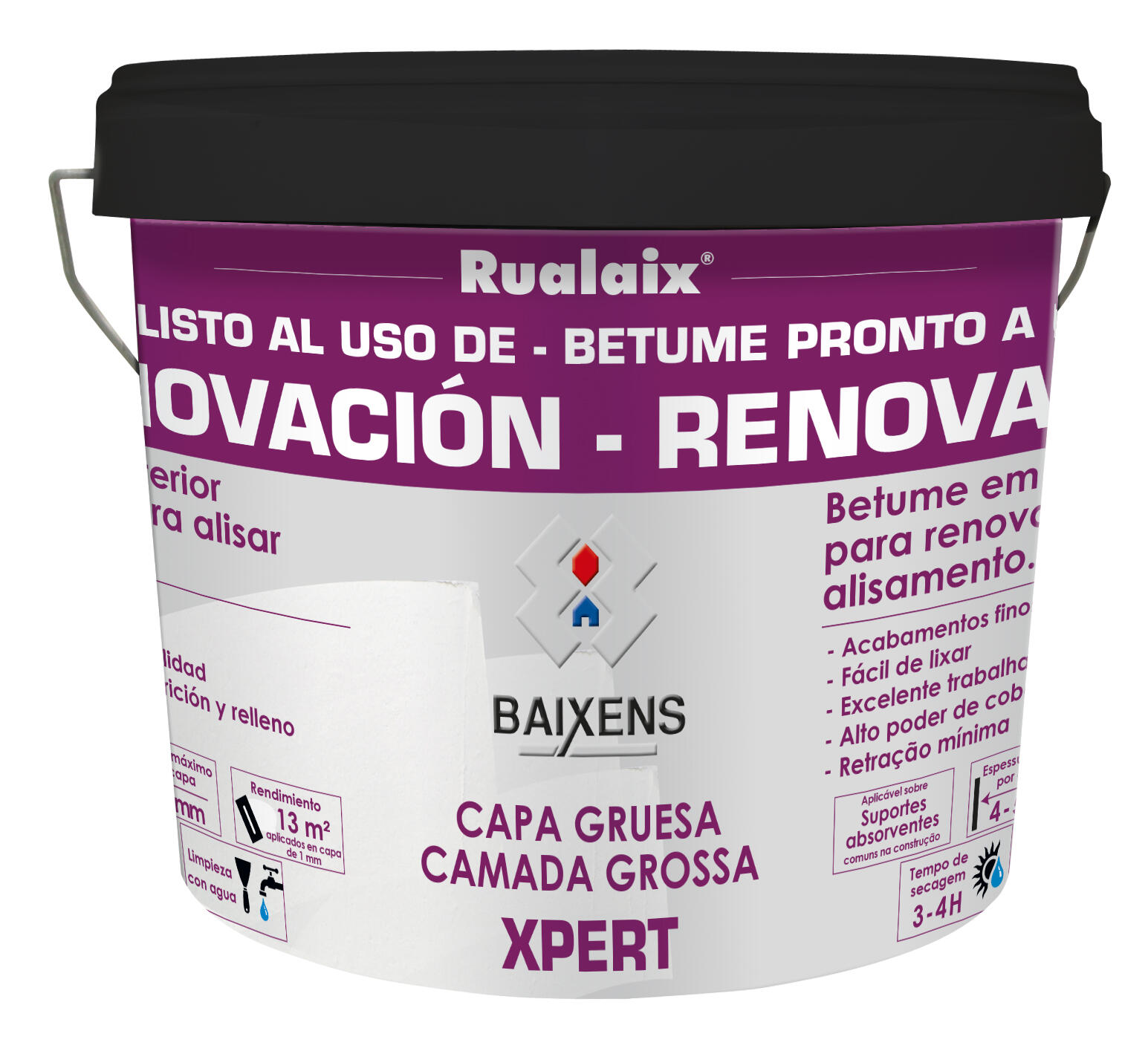 Este betume em pasta é ideal para renovação e alisamento de superfícies internas. É um produto pronto a usar que oferece excelente trabalhabilidade e um poder de cobertura elevado. Usos: renovar fundos antigos ou pintados, reparar riscos, golpes, arranhões e microfissuras, nivelar fundos em relevo ou texturizados, alisar gotelé plastificado. Material de Destino: gesso, estuque, fundos pintados, gotelé plastificado, tecido de fibra de vidro pintado, cimento e argamassas de cimento. Espessura da Camada: 3mm (máxima por camada). Tempo de Trabalho: 3 a 4 horas em suporte absorvente antes de pintar. Tempo de Secagem: 3 a 4 horas em suporte absorvente. Vantagens do Produto: alta tixotropia, fácil aplicação, retração mínima, baixo odor e possibilidade de aplicação fresca sobre fresca.