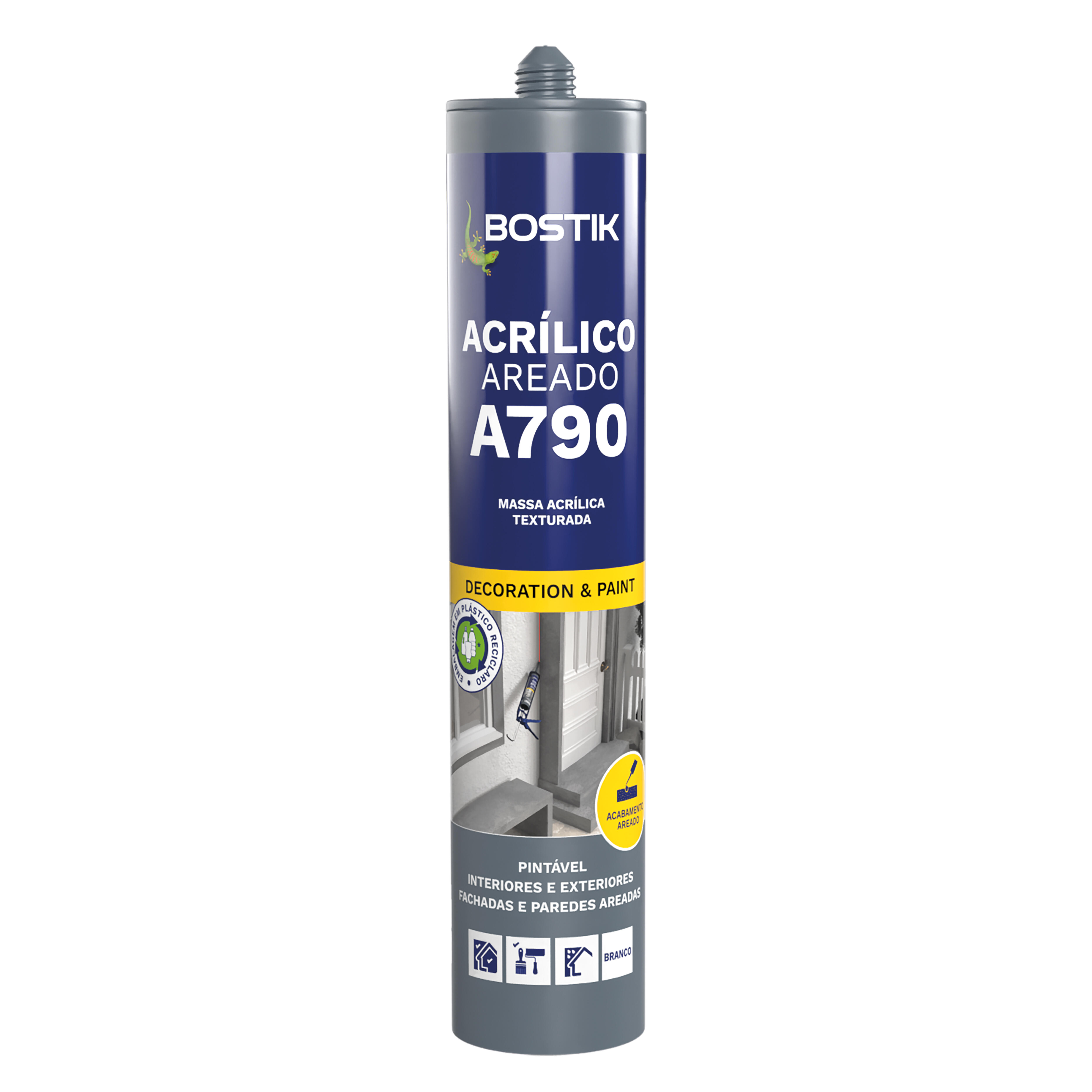 O Bostik A790 é um selante acrílico com textura areada, ideal para utilizações em interiores e exteriores, proporcionando flexibilidade e resistência nas aplicações. Descrição e Usos: este selante é indicado para reparação de fissuras e pequenas cavidades em superfícies como paredes, tetos e fachadas, admitindo pintura com tintas aquosas ou sintéticas. É compatível com diversos suportes, incluindo gesso cartonado, cimento e madeira. Descrição Comercial do Fornecedor: bostik A790 TEXTURED FINISH oferece um acabamento areado que pode ser intensificado com a aplicação de um pincel, mantendo a sua eficácia mesmo após a chuva, o que o torna adequado para uso exterior. Repintura: O selante pode ser pintado uma vez completamente curado, permitindo a personalização das superfícies. Vantagens do Produto: texturado com efeito areado, flexível, resistente a chuva algumas horas após a aplicação e ideal para selagens e reparações em sistemas de isolamento exterior.