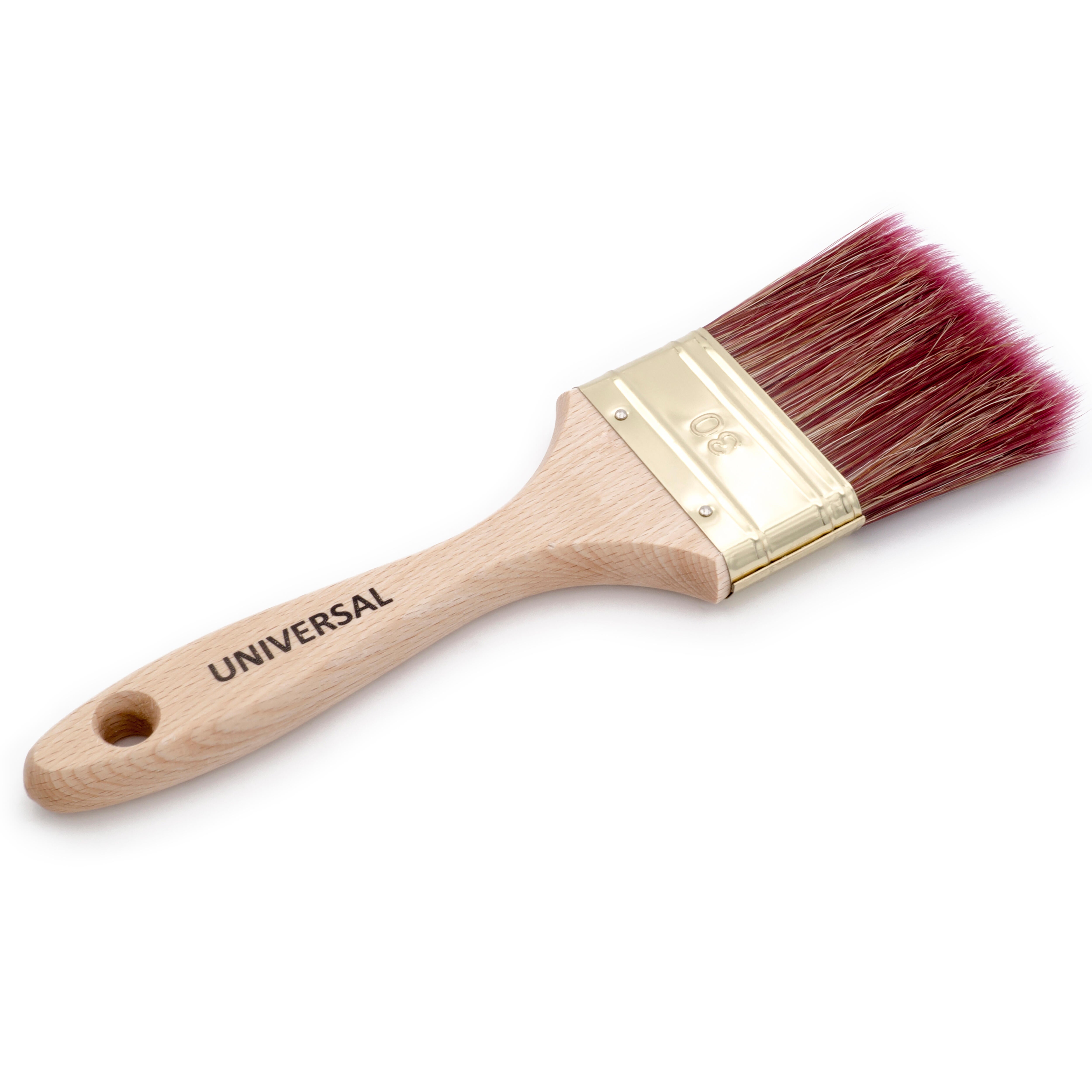Ideal para a aplicação em todos os tipos de pinturas, esta trincha combina a qualidade das cerdas naturais com uma carga máxima de tinta, proporcionando uma cobertura excepcional. Usos: adequada para pinturas com tinta base aquosa e solvente, assim como para vernizes e esmaltes. Material do cabo: madeira faia encerada. Material da fibra: 50% cerda Chungking e 30% PBT + 20% PET. Tipo de produto: aplicador. Largura (em mm): 60mm. Marca: Universal. Vantagens do Produto: A espessura ideal e o peso reduzido facilitam o manuseio, tornando esta trincha perfeita para profissionais e DIY.